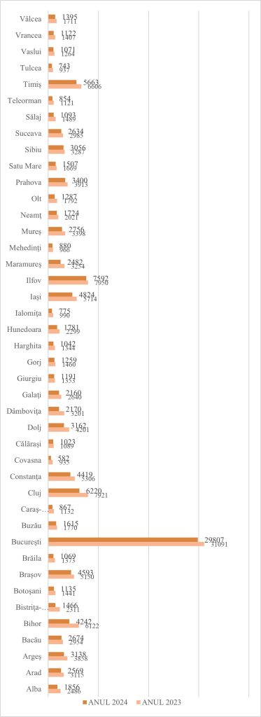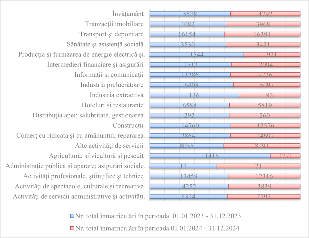 O primă remarcă în acest cadru, este redată de scăderea per ansamblu a numărului de înmatriculări a companiilor în anul 2024 spre deosebire de anul 2023. Concret, anul trecut au fost înmatriculate cu 22128 mai puține companii spre deosebire de anul 2023.