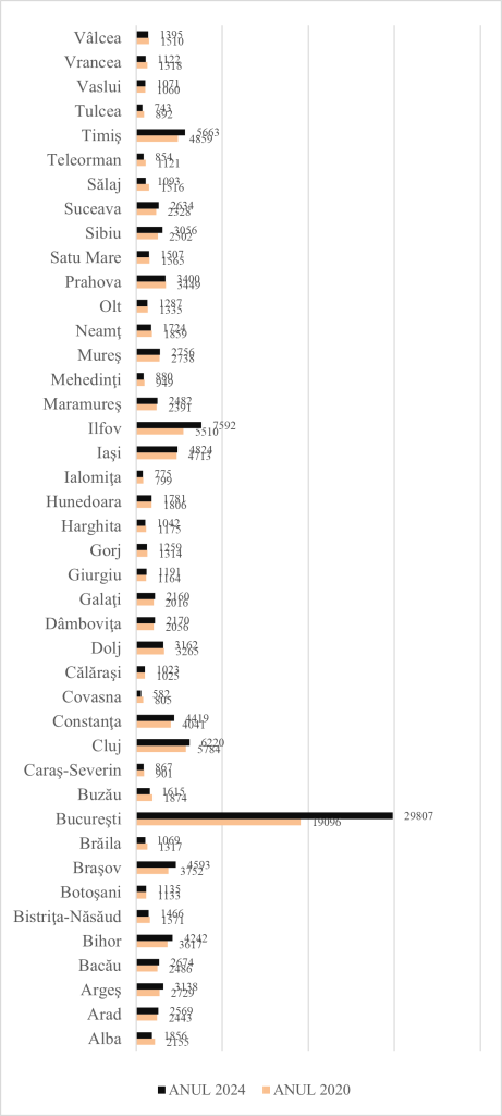 Graficul alăturat reflectă imaginea înmatriculării de companii la nivel regional în anul 2023 și anul 2024. O primă observație cu privire la imaginea fenomenului este redată de scăderea companiilor înmatriculate în anul 2024 față de anul 2023 cu aproximativ 15 procente. Cele mai multe companii înmatriculate în anul 2023 precum și în anul 2024 sunt identificate la nivelul Bucureștiului, urmat de județul Ilfov, Cluj, Timiș și Bihor. Județele în care se înregistrează cele mai mari scăderi absolute în intervalul 2023-2024 au fost: Bihor, București, Cluj, Dolj și Dâmbovița.