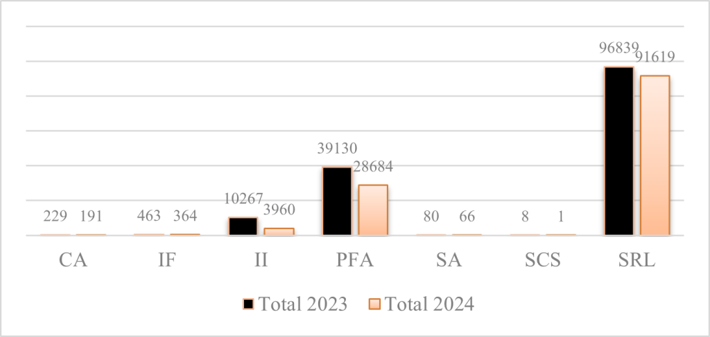 Cele mai multe tipuri de companii înmatriculate în perioada 2023 și 2024 au fost reprezentate de PFA-uri și SRL-uri. Din anul 2023 până în anul 2024, toate formele de organizare a companiilor au suferit o serie de modificări negative, în sensul scăderii fenomenului de înmatriculare la nivelul acestora. Cea mai semnificată scădere a fenomenului este identificată la nivelul societăților în comandită simplă, unde remarcă o rată negativă de 87,50%, urmat de întreprinderile individuale cu un procent de 61,42% și persoanele fizice autorizate cu o rată de 26.69%.