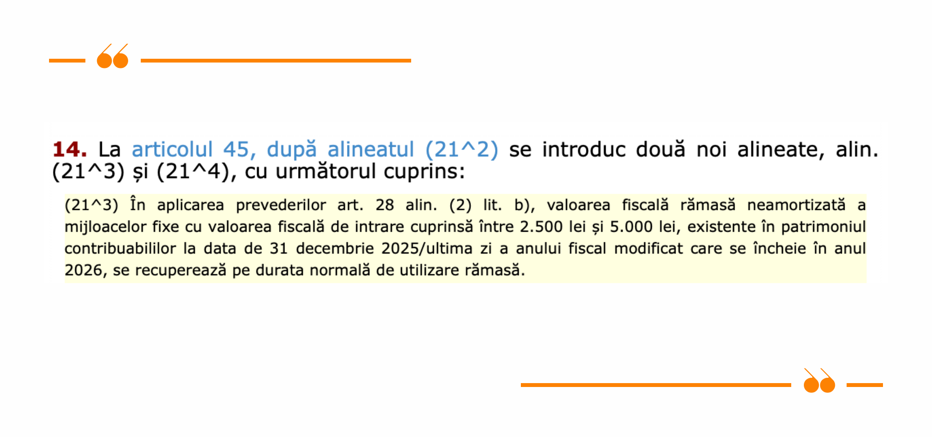 Răspunsul vine tot din OUG nr. 8/2026, care a introdus în Codul fiscal art. 45 alin. (21^3), care prevede că valoarea fiscală rămasă neamortizată a mijloacelor fixe din acest interval, existente în patrimoniu la 31 decembrie 2025, se recuperează pe durata normală de utilizare rămasă. Altfel spus, dacă un bun a fost încadrat corect ca mijloc fix când pragul era cel vechi, el rămâne în aceeași logică fiscală până la finalul amortizării. Nu se reclasifică retroactiv și nu se mută direct pe cheltuieli doar pentru că s-a schimbat plafonul. Aici este esența practică a modificării: regula nouă se aplică activelor noi, nu rescrie trecutul.
