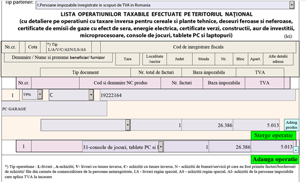 PC Garage ne-a emis o singura factura, cu TVA de 19% pentru produsele de intretinere calculatoare si cu TVA 0% avand codul VATEX-EU-AE pentru cele 3 laptopuri (valoarea lor totala fiind de 26385.69 lei) pentru care va trebui sa facem taxare inversa.